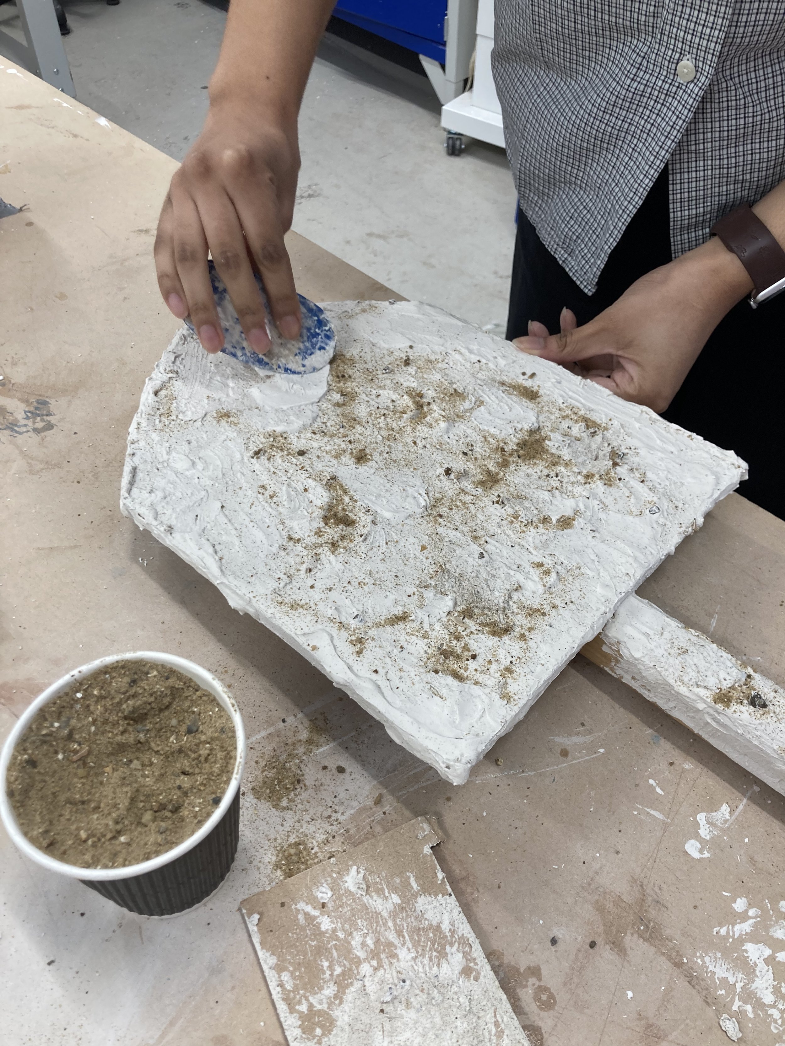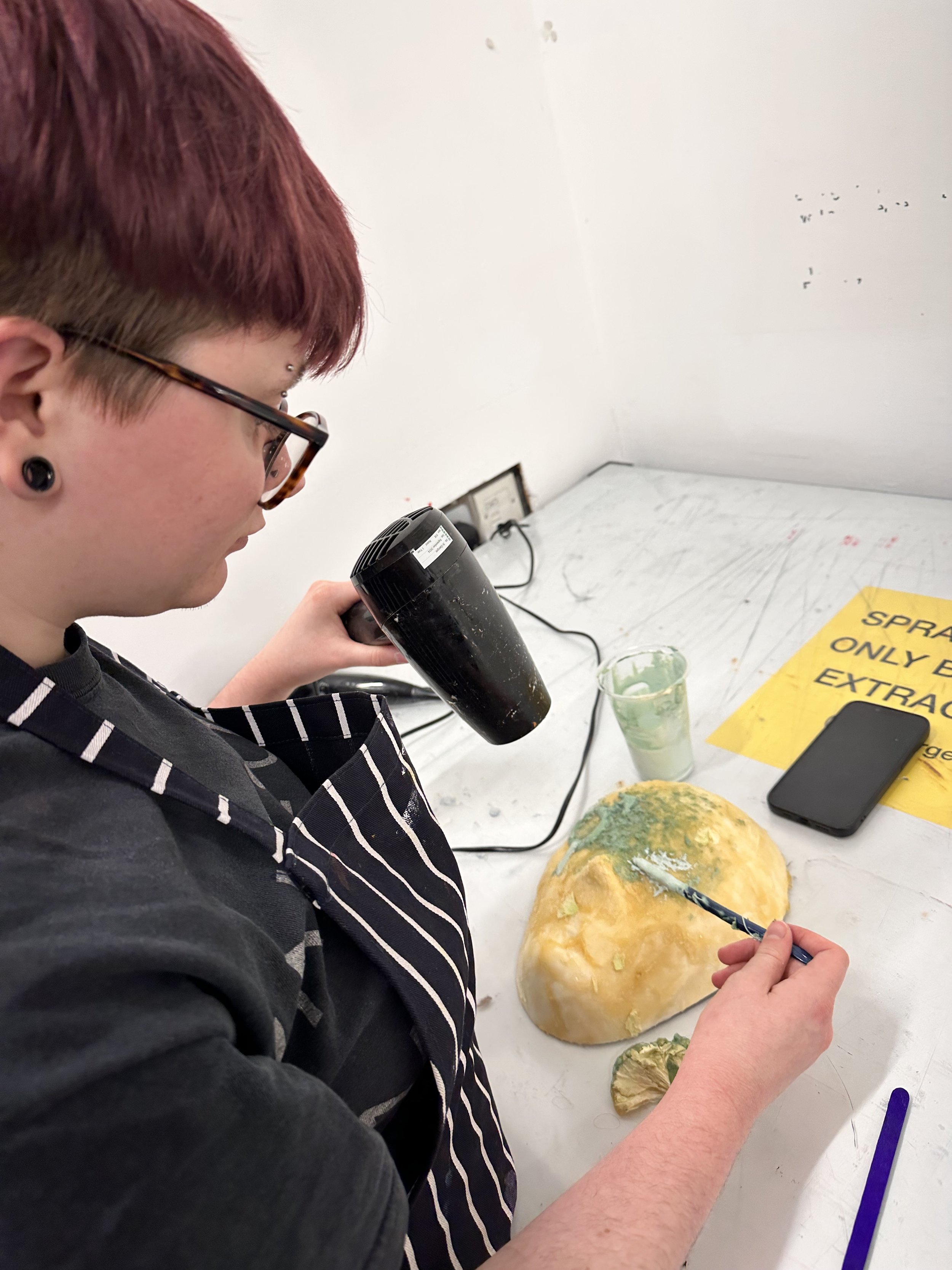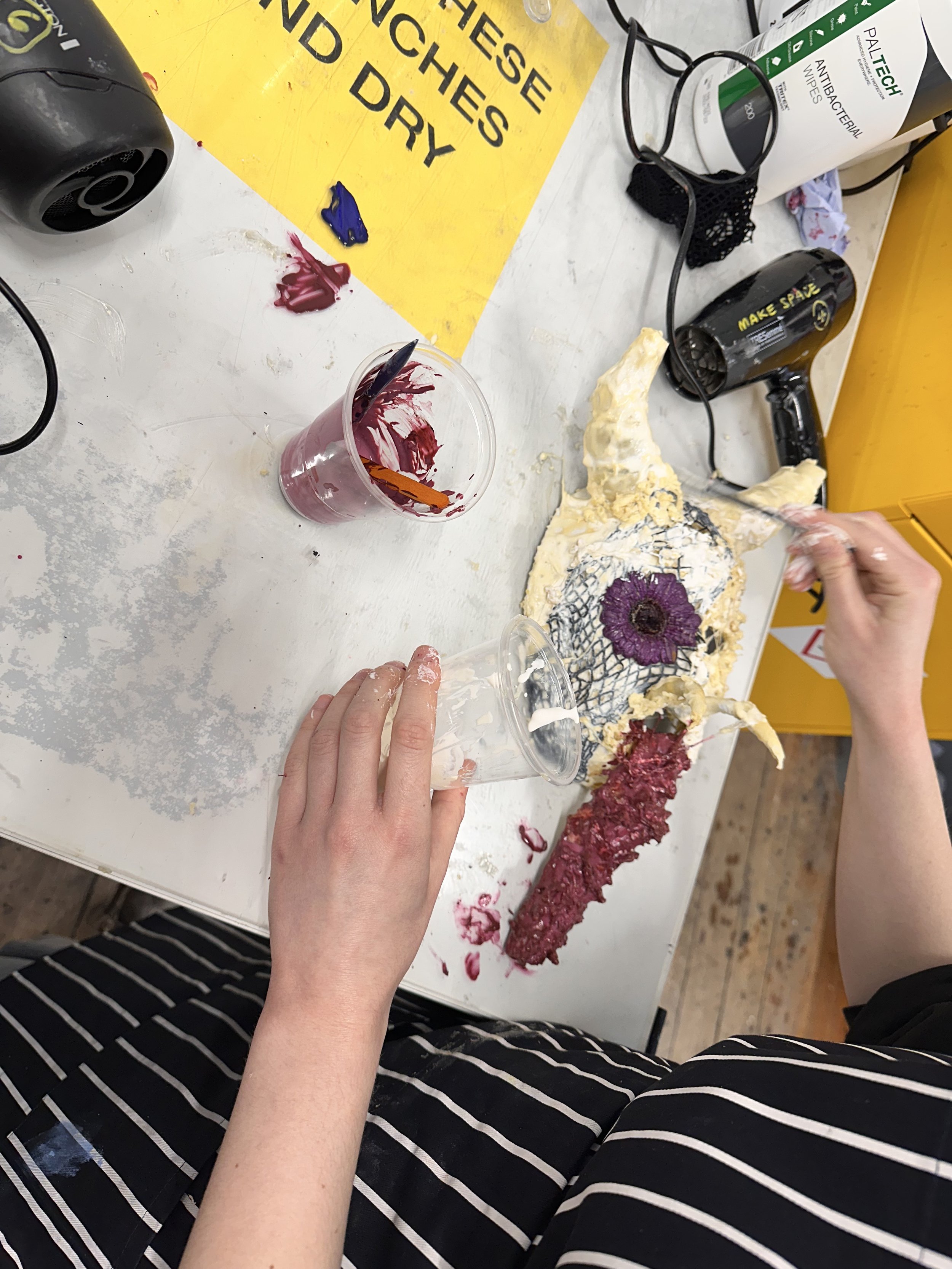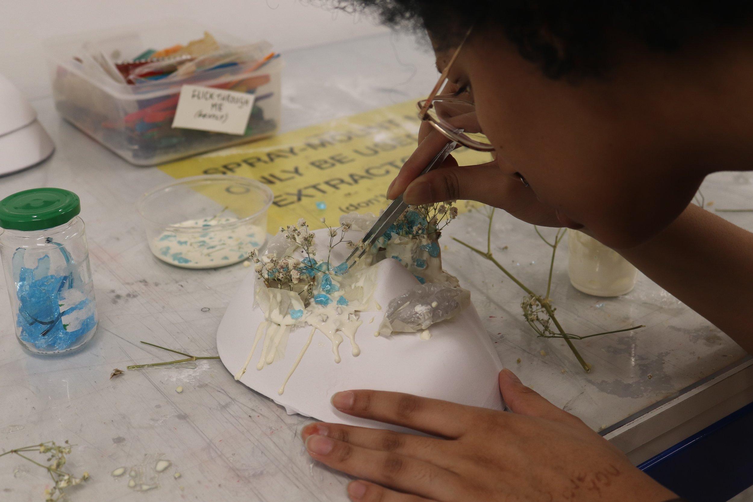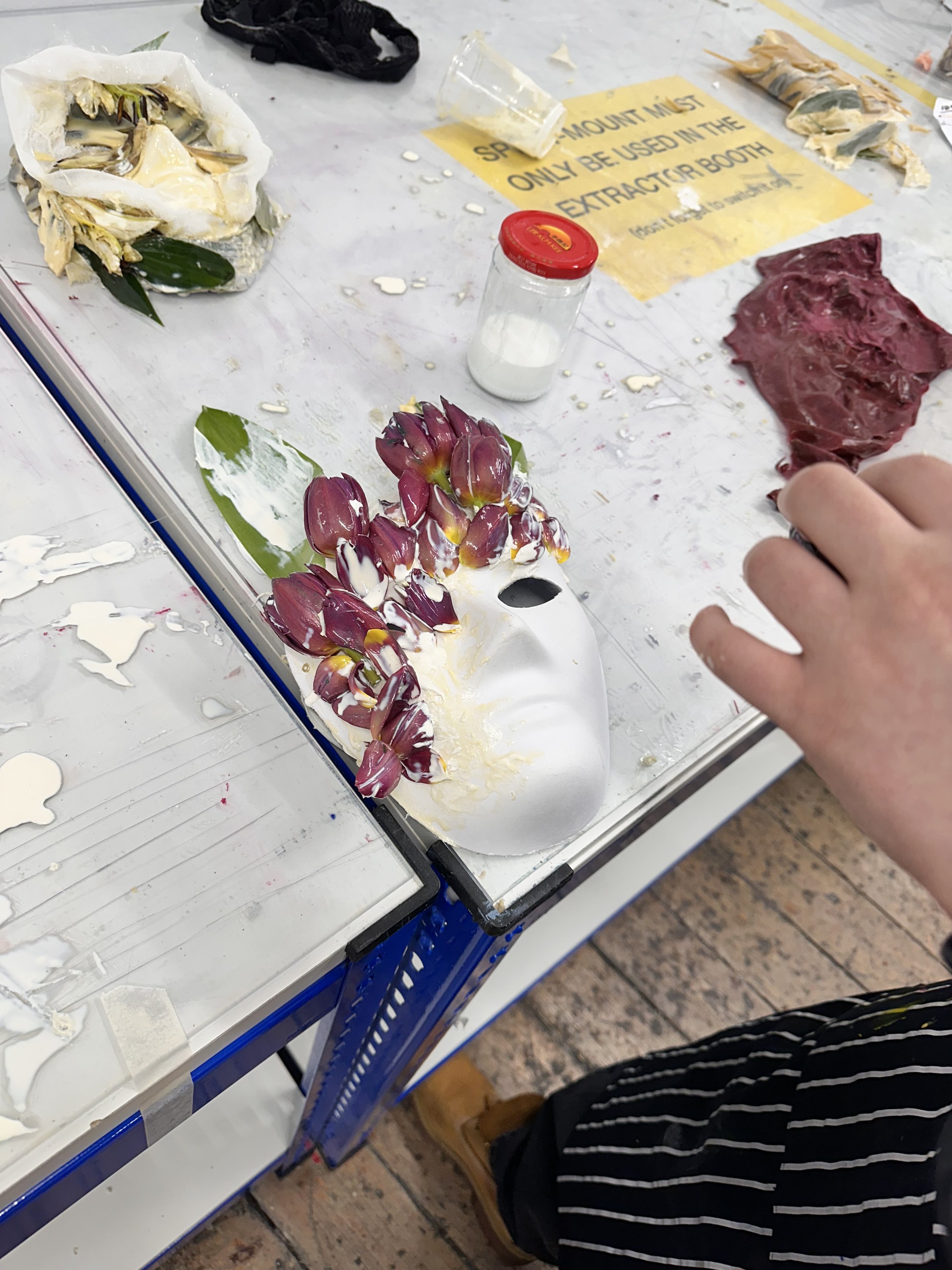 Students began bringing their identities to life in the first visual workshop with third-year fine art student Michelle Gumbo. Each chose a flower to represent themselves and transformed it into a mask using latex and natural materials. With Michelle’s guidance, they experimented freely, creating a diverse range of masks that capture personal narratives and the song’s lyrics.